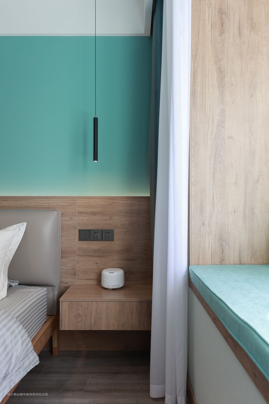 采用软装配色来突出设计感,窗帘、床品、装饰物在配色上高度统一。