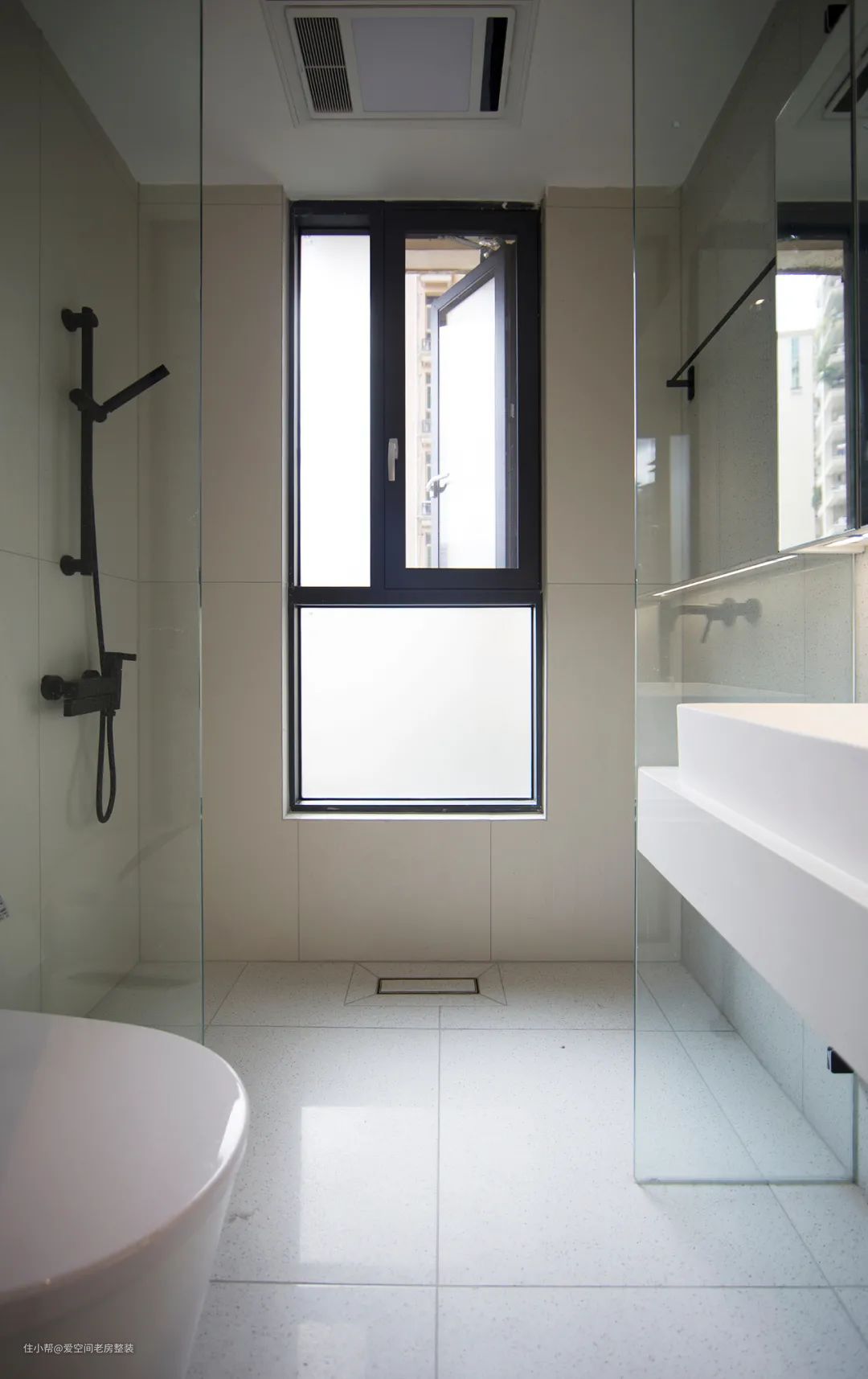 主卫墙地砖一体,同色系看起来亮堂又干净。浴室柜悬空很好清洁打理,淋浴区用玻璃隔断阻隔水汽,加上墙面有通风口,室内比较清爽。
