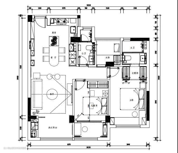 ▲ 平面布局图 设计策略: 1. 去掉部分非承重墙,将原封闭厨房改为开放式。 2. 将主卧和主卫之间的走廊利用起来,打造成衣帽间。 3. 阳台一分为二,儿童房的阳台收进室内,变成了孩子的游戏区。