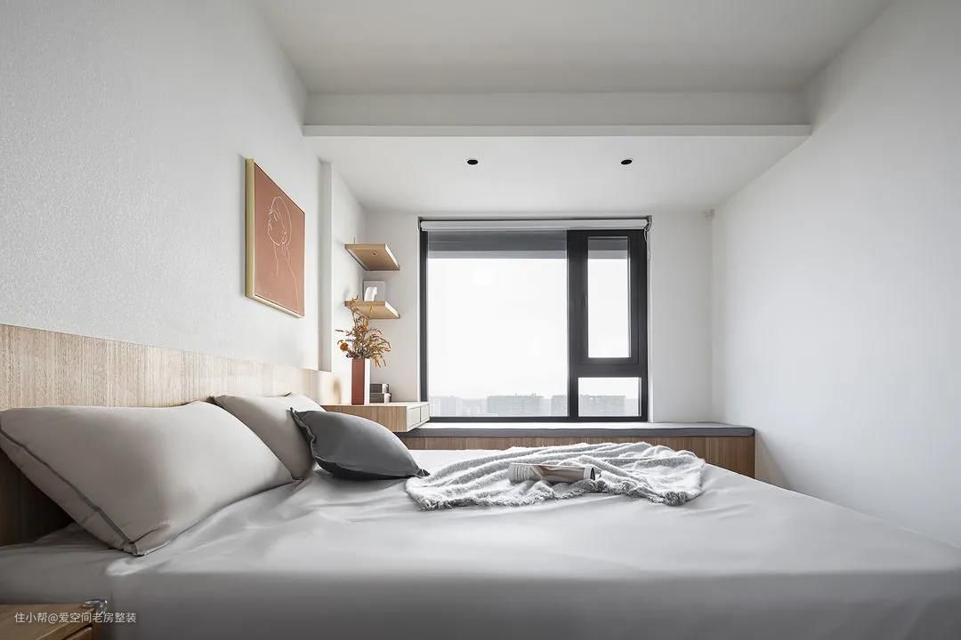 次卧多数时间是闲置的,只有两边老人偶尔过来小住一下,简单布置大床、床边柜以及飘窗,满足睡卧和休闲,视觉上很舒适。