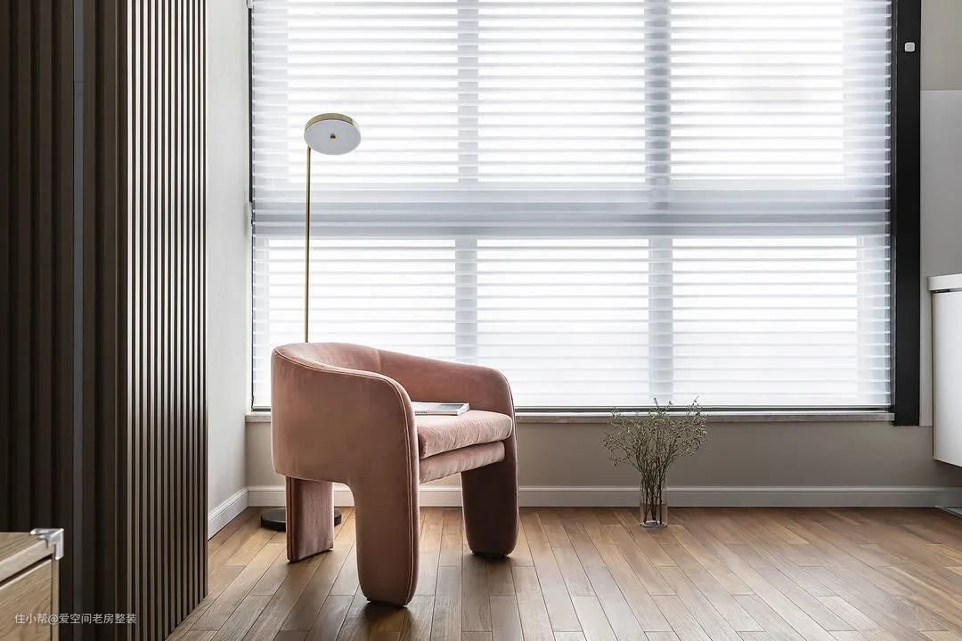 珊瑚橙单椅纯净浪漫,风从窗外吹来,带着春天的味道,百叶窗既阻挡光线,又能保留空间的通透。 抛开家务琐碎的日常,女主人坐在此处翻阅一本心仪的杂志,与客厅玩耍的宝宝时不时的互动一下,和孩子的相处时光里,也可体会到岁月静好。