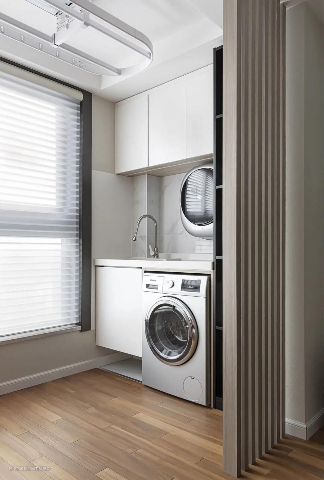 木栅格,作为客厅和阳台的界线,营造虚实相生的意蕴。 阳台另一侧改为兼顾洗晒衣物和休闲的多功能区。洗烘一体机搭配阳台上的智能晾衣架,哪怕是封闭阳台也不怕潮湿问题。