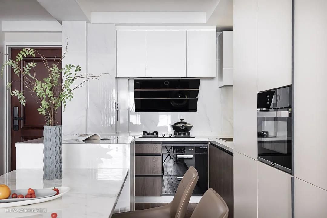 靠墙做了餐边柜,厨房电器嵌入内部,留白设计,清新又美观。