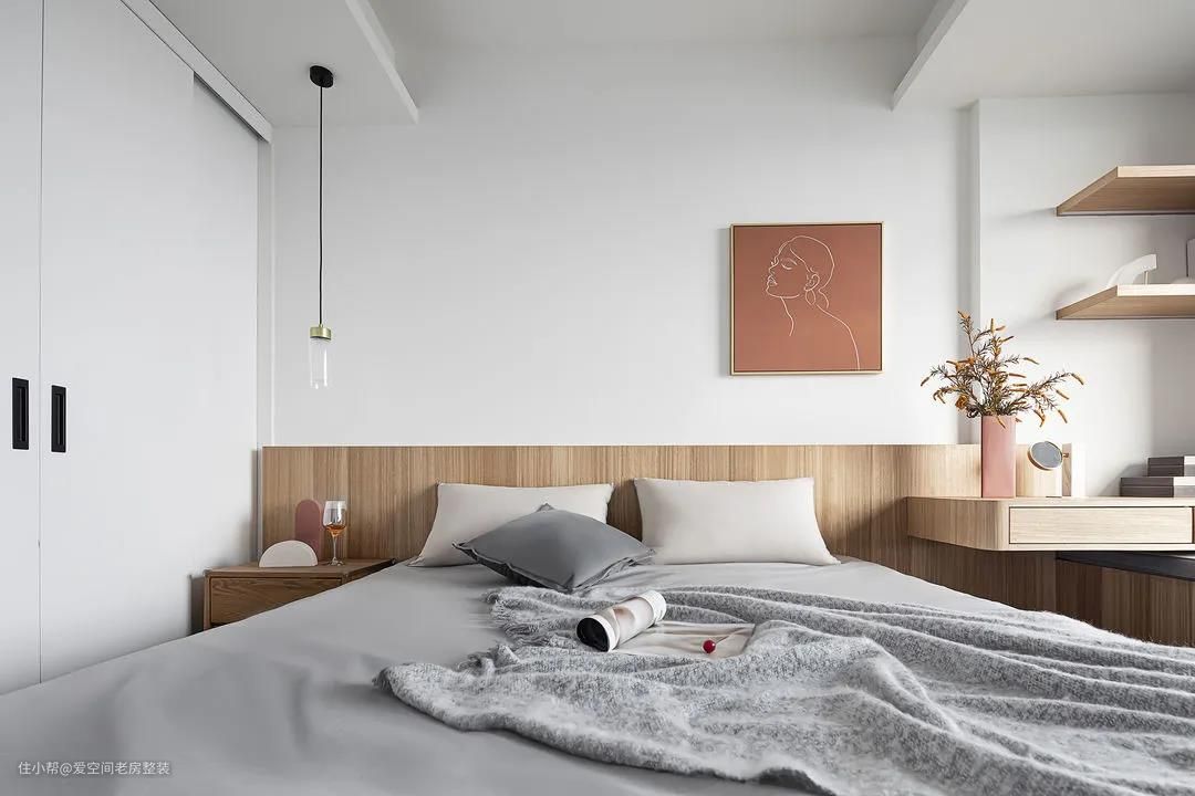 木饰面的床头勾勒出生活中一方直抵心灵深处的舒适世界,直白而简洁的色彩,传递出屋主对生活不拘一格的态度。