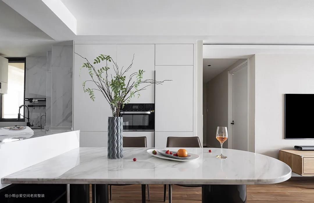 客餐厅一体化布局,用吧台做隔断,不但可以帮助厨房分区,还能充当临时备餐区和餐桌,增强实用性,一举两得。