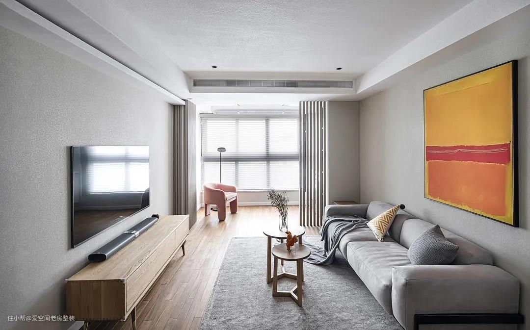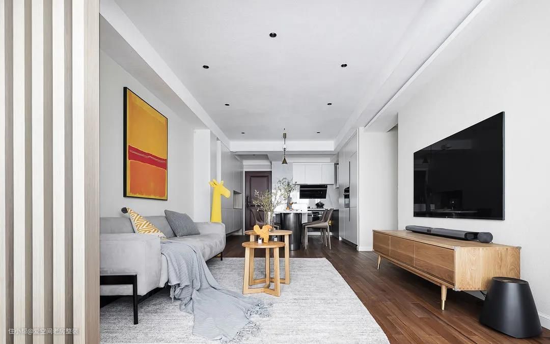 硬装线条回归简约,无主灯+局部吊顶,让层高更为开阔。 考虑到屋主家宝宝还小,在客厅玩耍时间较多,茶几选择轻便可搬移款式,圆滑的边角,安全系数也更高。