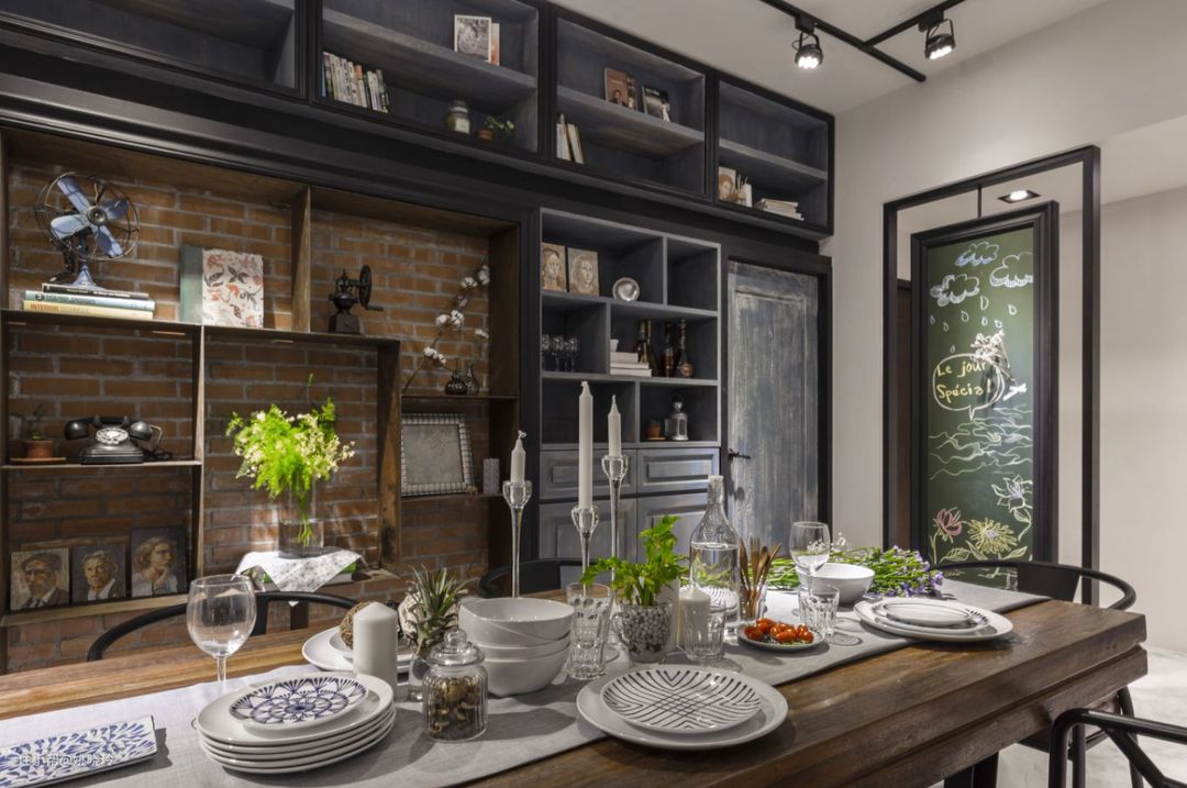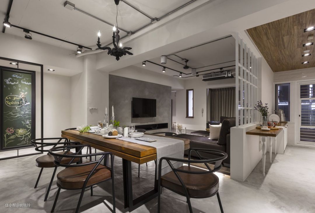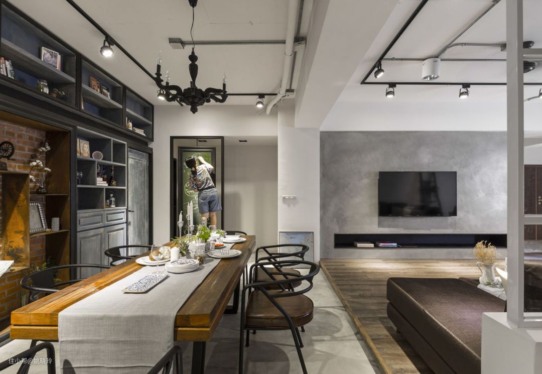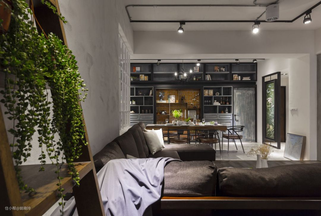 采用开放式的格局,客餐厅一体化设计,棕色的木质台面搭配深色柜体,延续工业风的格调,在视觉上既缩短了走道的距离,也使空间更为紧密一些。
