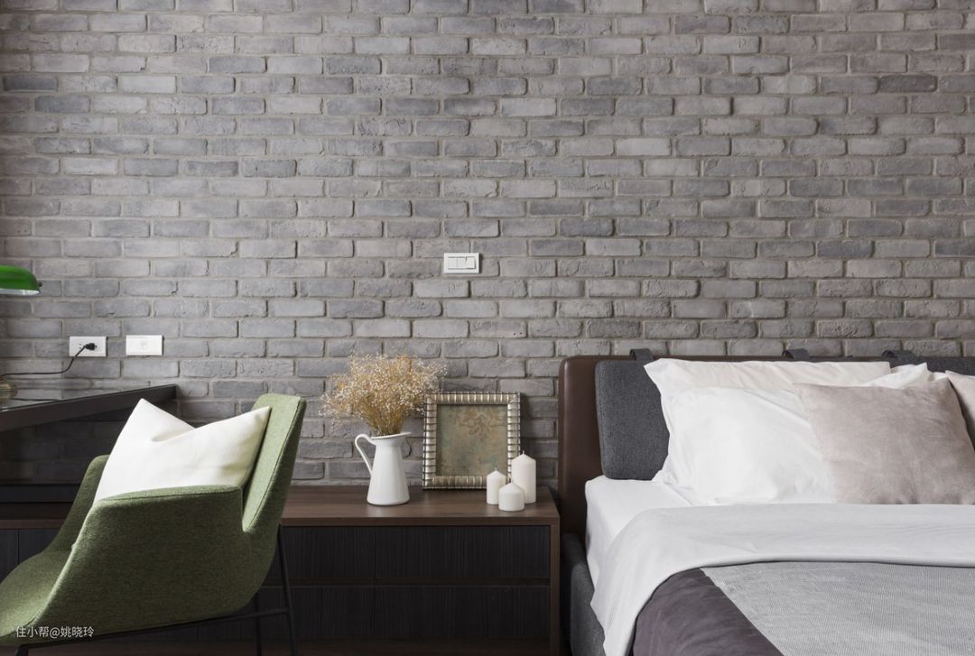 主卧背景墙是一整面的砖墙,材质是青砖墙,就像是民国时期的,特别是复古的棕色和绿色的台灯。