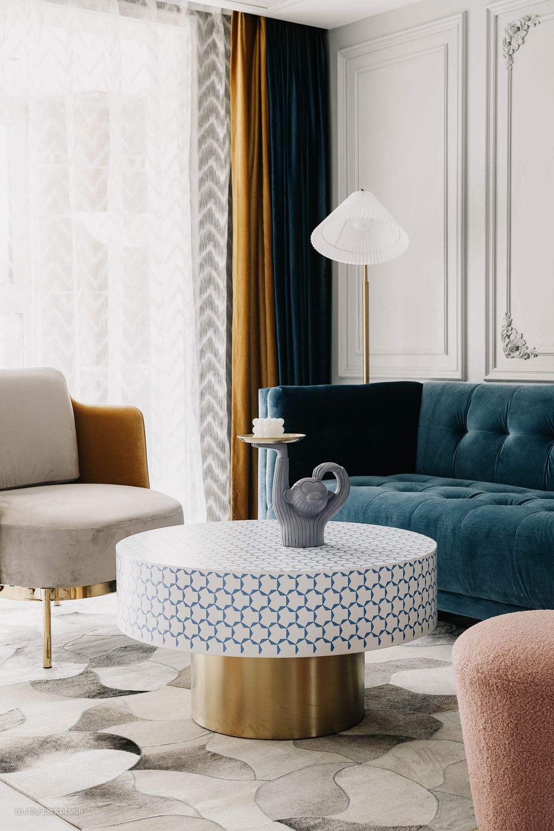 客厅阳台直接选择了拼色窗帘,软装特意选了布样,窗帘的蓝与沙发一致。家具凳角都是金属元素,单椅的金属脚十分可爱。 电视墙上雅白的壁炉造型,柜子里女主人精选挑选的摆件布置,结合现代优雅的空间布置,也显得格外的高级轻奢。 为了便于打理,墙面并不是直接乳胶漆,而是贴了海基布再刷的防水乳胶漆,防止宠物挠抓,日后脏了可以直接用湿抹布打理。