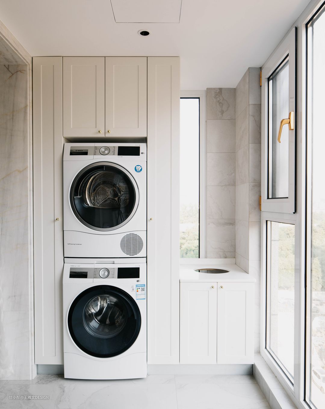 洗衣机,烘干机搭配,解放传统阳台只为晾晒而存在的尬区,同时整体定制柜子设计,满足猫的日常屯粮和一系列日常用品,同时加入电动猫砂以及空气净化设计。 房子是自己花真金白银买的,家里的每一寸土地都是自己的,阳台的主人是谁还用说吗?但是,她家阳台真正的主人不是她,是她养的喵。