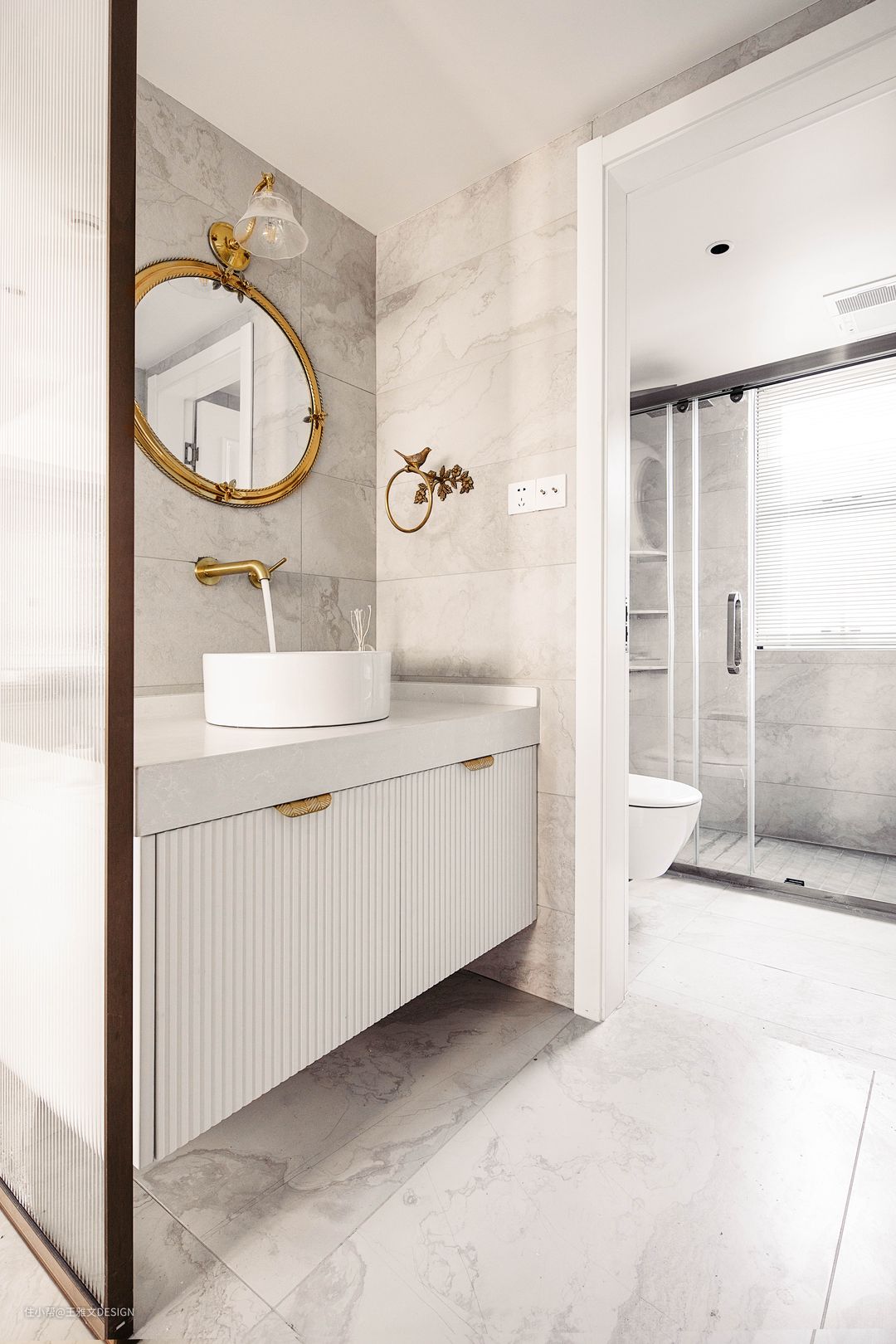 次卧室打开对面是次卫干区,做了金色玻璃隔断,跟整体的风格相呼应。次卧业主喜欢墨绿色,用两种绿色拼接加墙纸搭配,营造出复古混搭的效果。