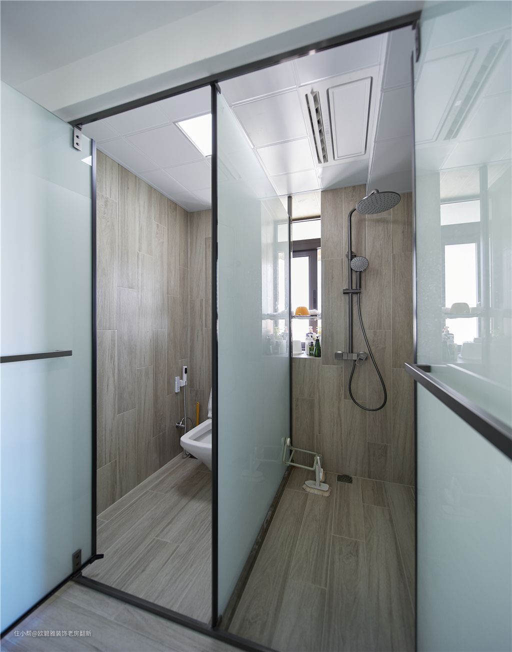 原来只有2m²的卫生间,分别设计了独立马桶区和淋浴区,为屋主实现真正意义上的三分离。 空间采用仿木纹砖与外界地板相呼应,和谐统一显得质朴而温暖。