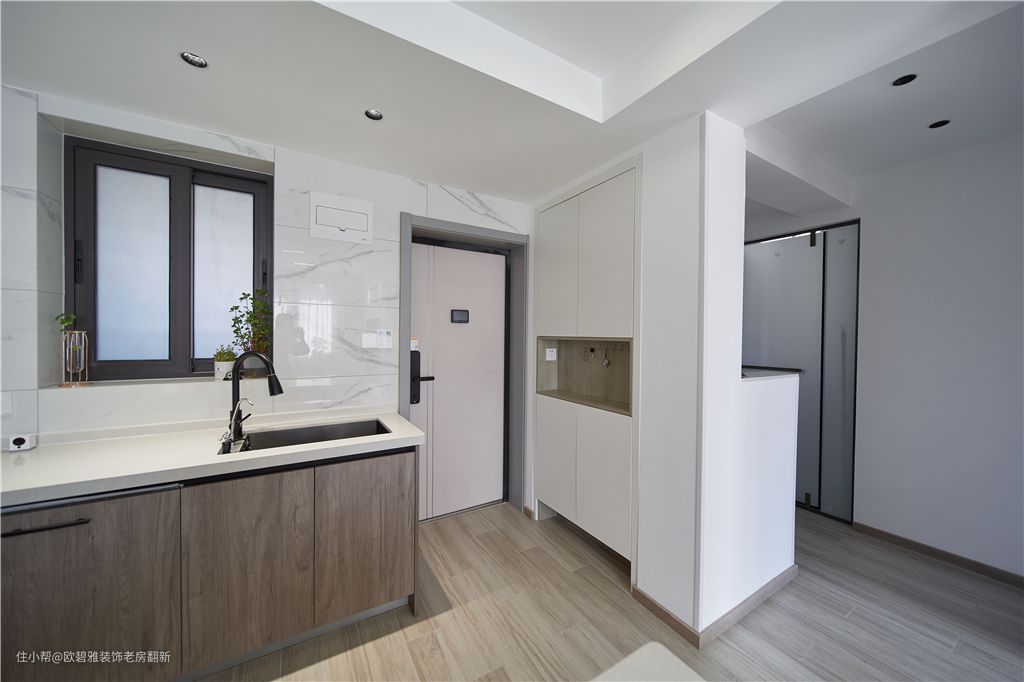 原户型入户便是厨房和过道,难以规划独立储物空间。为解决这个缺陷,设计师拆除厨房墙体,利用过道区定制一组嵌入式通顶玄关柜,搭配按压式双饰面板,使柜体与墙面完美融合,视觉感更加整洁、统一。
