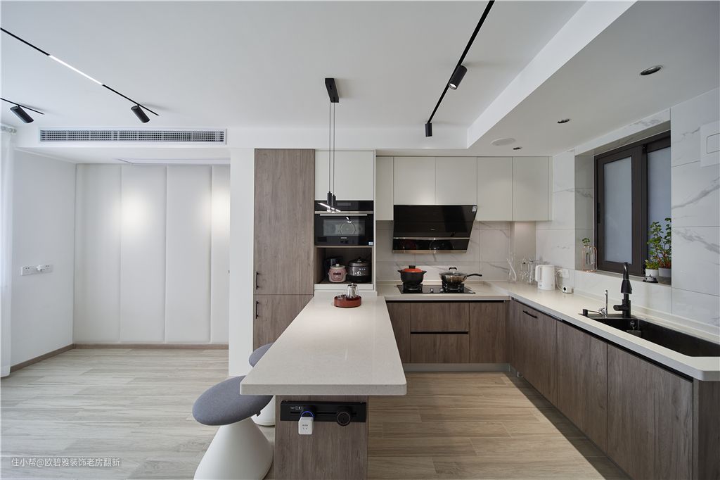 打通后的客厅与厨房,面积只有17m²,为了避免餐厅带来的局促感,设计师取消了独立就餐区,结合开放式厨房定制中岛吧台,使厨房形成一个“U”形的操作台面,既能当餐桌、吧台使用,也可以作为厨房的切配台面补充。