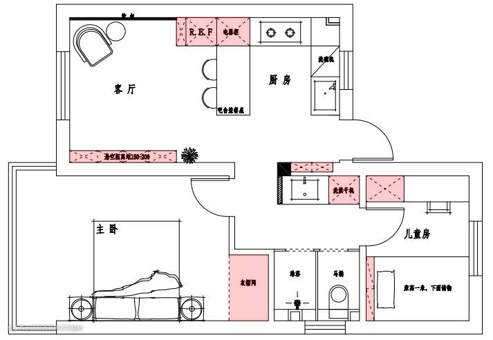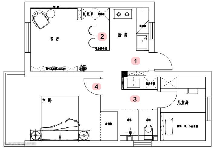 //原始户型// ①进门给人局促感,无玄关过渡区和储物空间。 ②独立厨房较封闭,采光性能较差,且无独立餐厅区域。 ③卫生间空间小,整体舒适度不是很高。 ④主卧有独立阳台,空间采光和收纳一般。