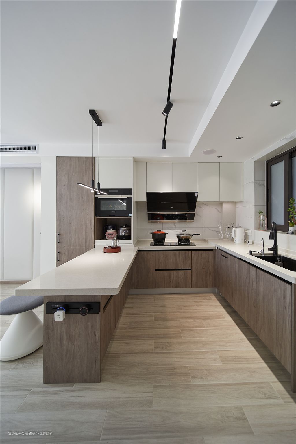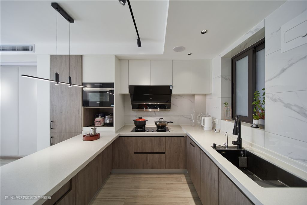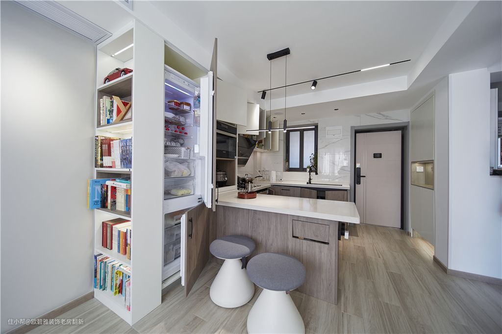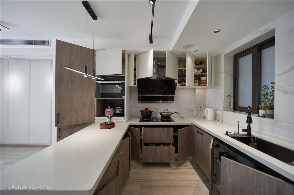 别看餐厨面积小,它的储物能力真的很强,嵌入式冰箱、烤箱、碗篮、洗碗机、调味篮.......设计,可以把家里大部分杂物都“藏”在其中,一寸空间也不浪费,既整洁又美观。