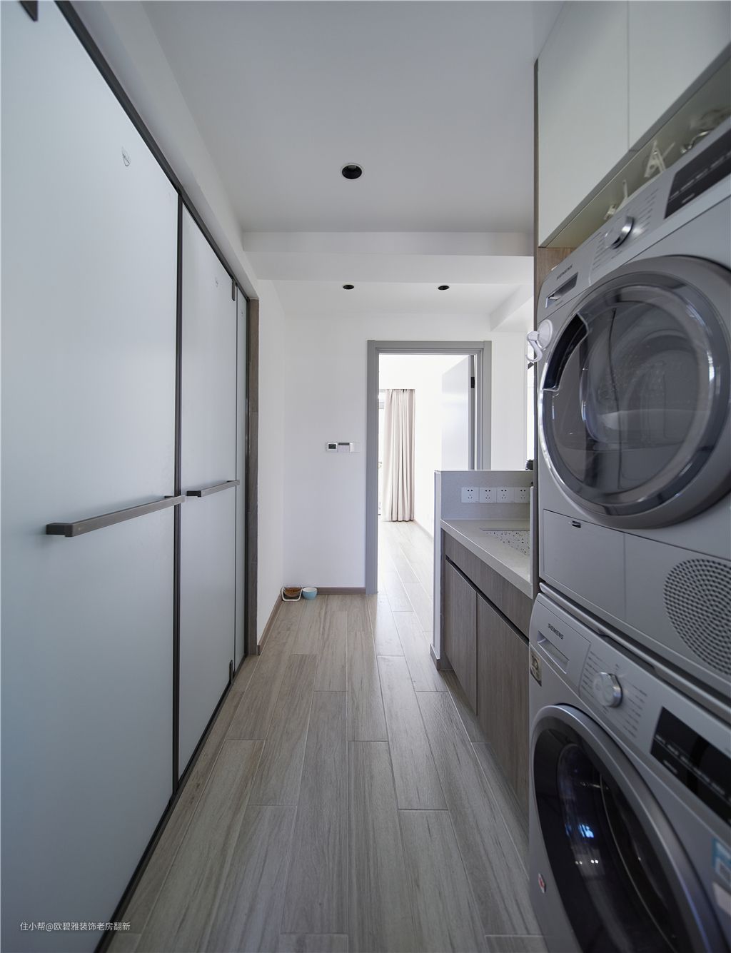 洗漱区连接次卧设计一面深60宽70公分的通顶式储物柜,将洗衣机、烘干机上下叠放嵌入柜体,不仅能提升过道空间的实用性,还能有效地将空间利用到极致。