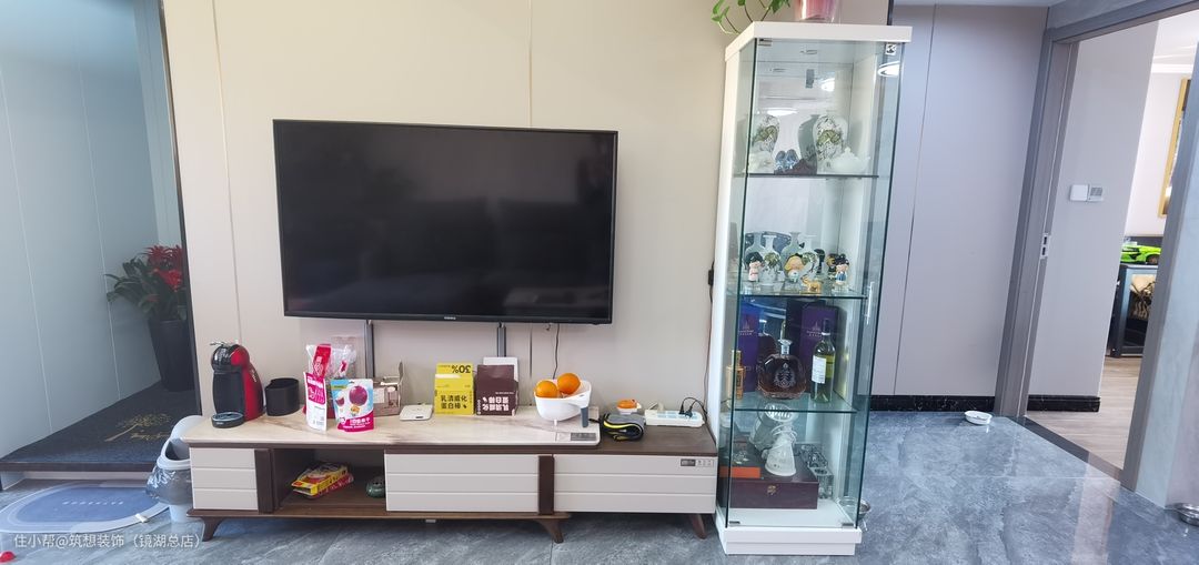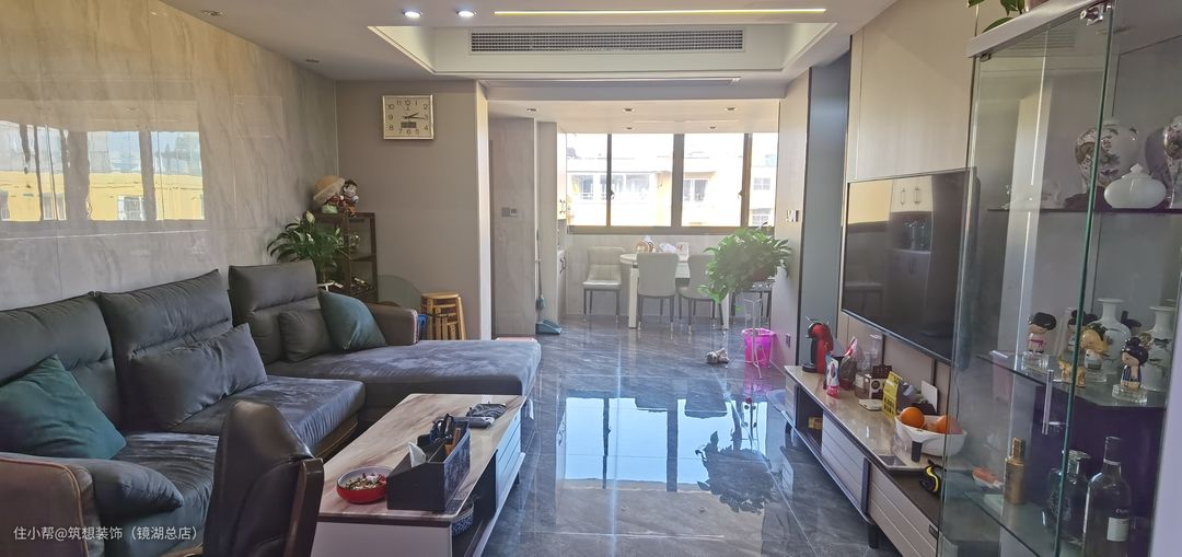 装修后,电视上墙,软装布局,中央空调加长风口。虽然视觉空间缩减了,但是南边砌墙重新做水电后,增加了2个卧室房间,居住功能性更强了