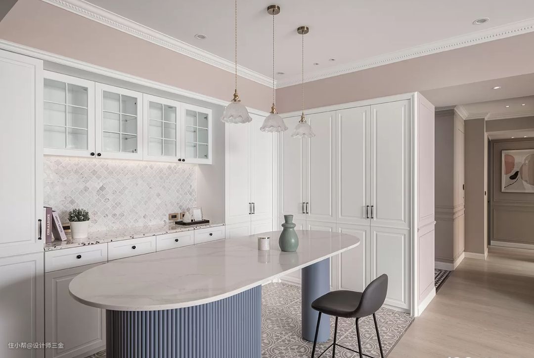厨房的配色是优雅的湖蓝色搭配灰蓝色,一眼看就很高级舒适,上方做了吊柜增加了收纳,打扫起来也很方便,在这样厨房做饭心情都能非常好。
