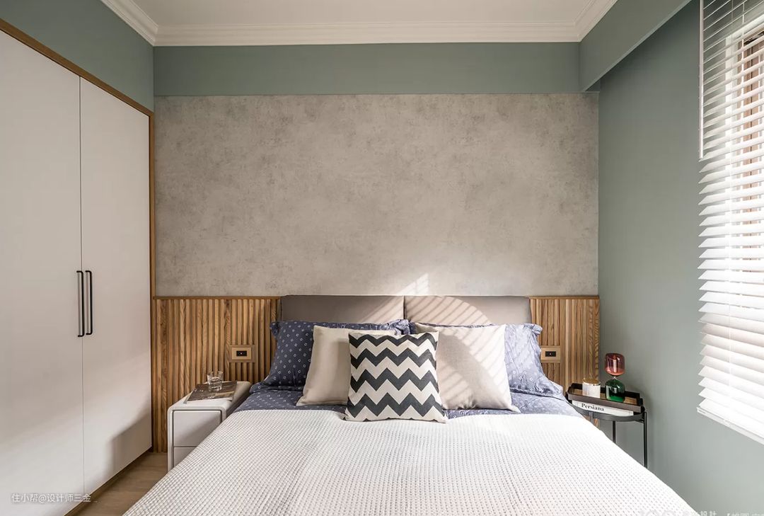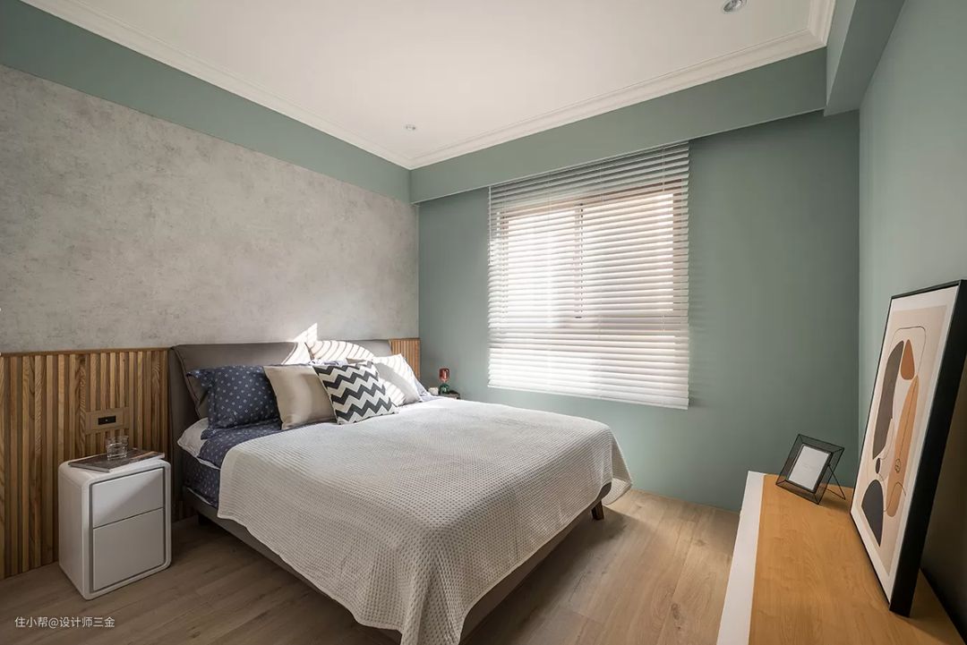 整体卧室绿色和灰白色调,柔和的氛围中,不会显得特别单调,配合空间有层次感。
