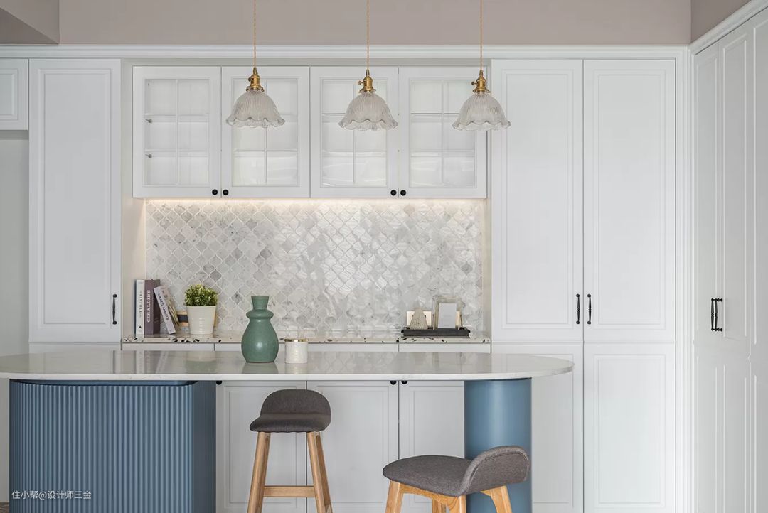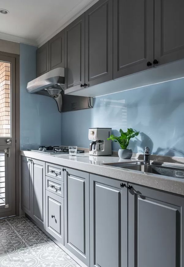 厨房的配色是优雅的湖蓝色搭配灰蓝色,一眼看就很高级舒适,上方做了吊柜增加了收纳,打扫起来也很方便,在这样厨房做饭心情都能非常好。
