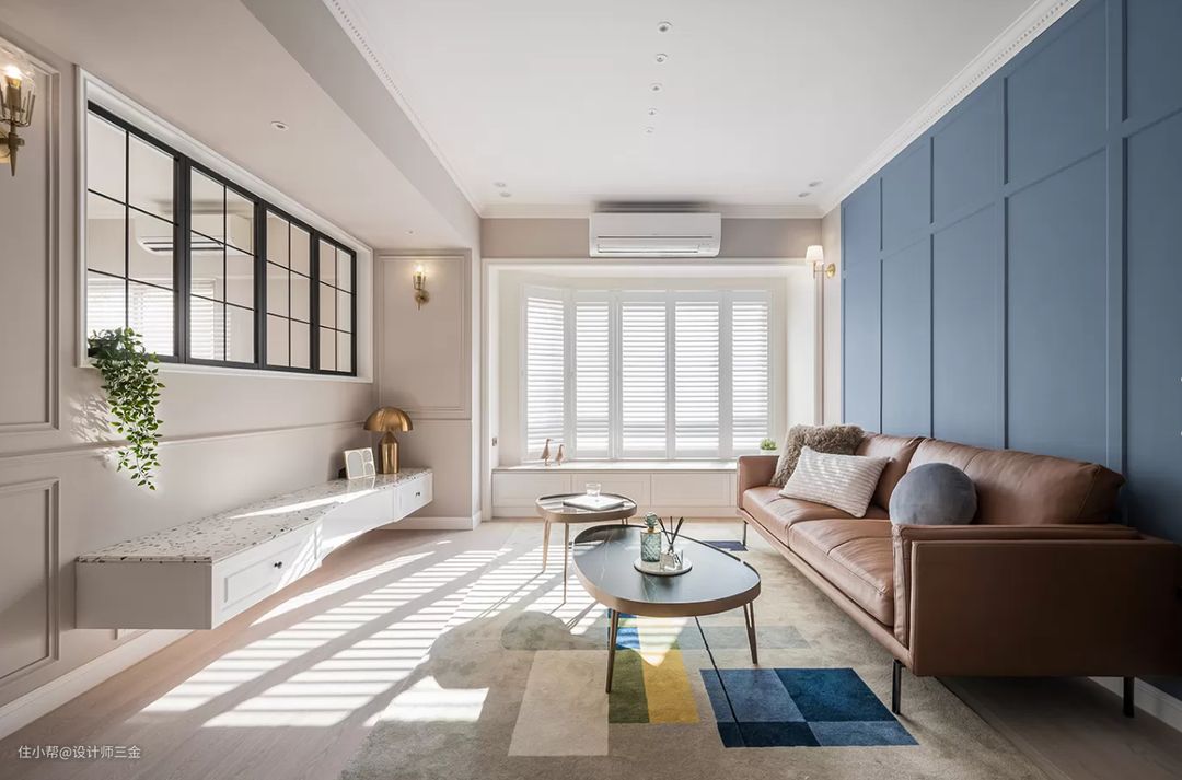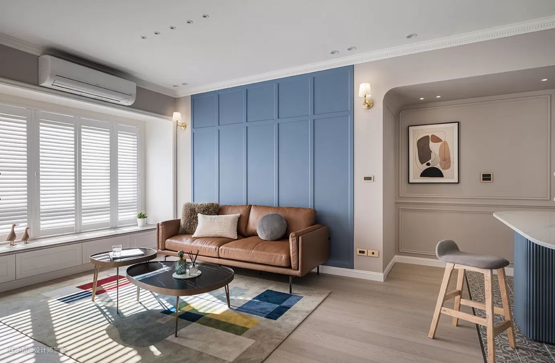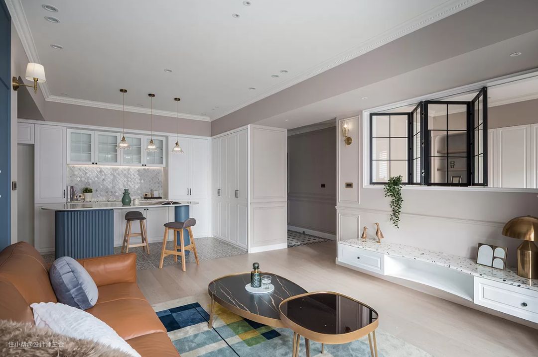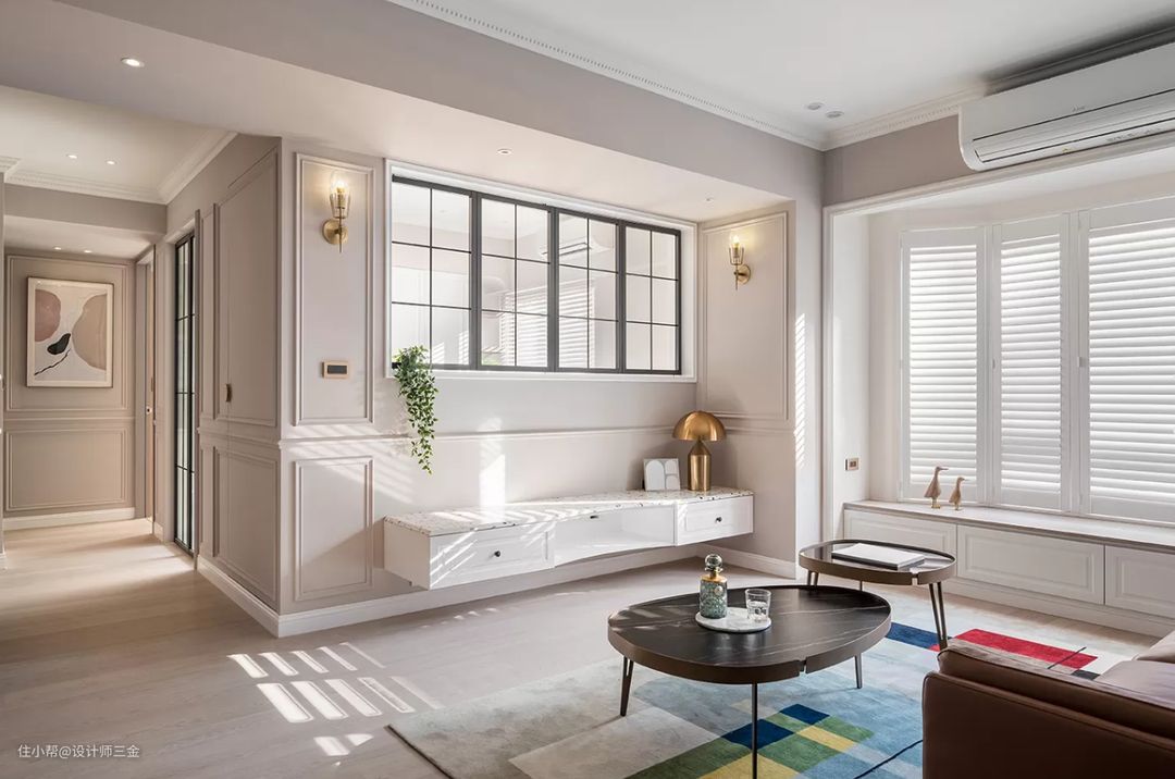 客厅沙发背景墙和电视墙这两面做了一个呼应,电视背景墙采用低饱和度的杏色,不会产生审美疲劳,大体基调还是奶油色调打底,很难不爱呀。