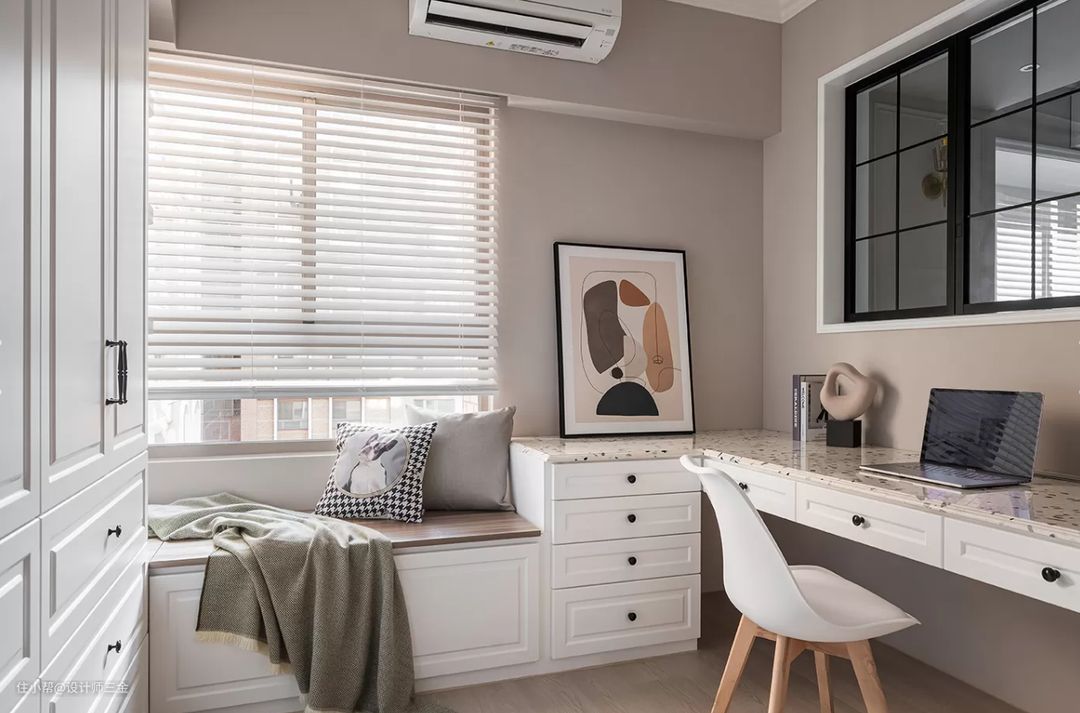 书房是做到衣帽间兼书房二合一,解决了空间只能阅读办公的单一性功能,实现了一个日常必需的的多功能空间。