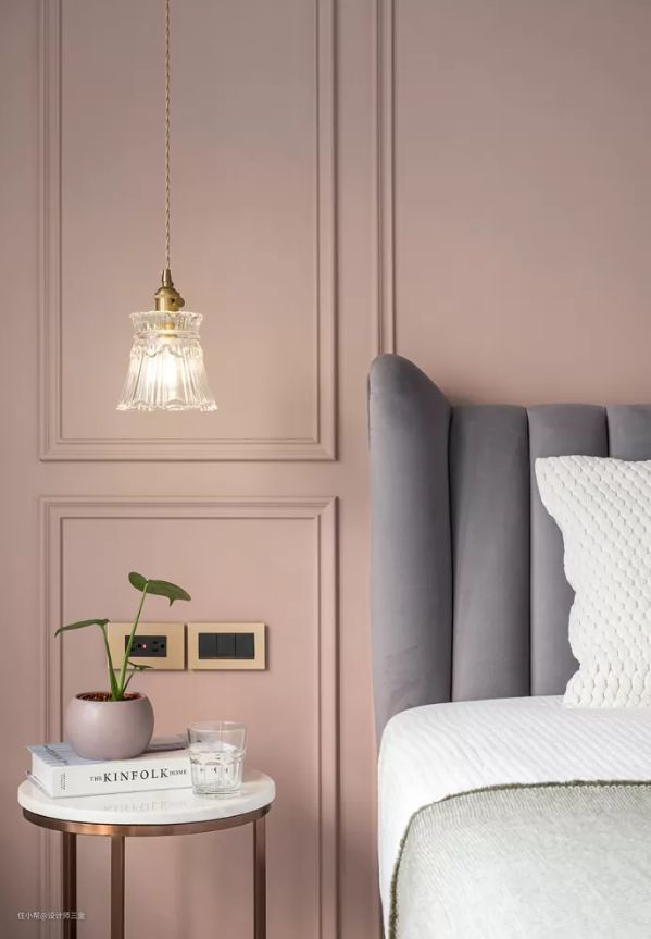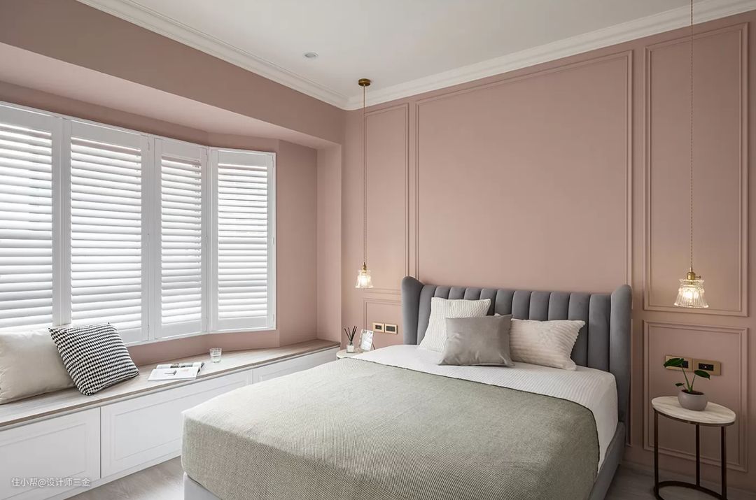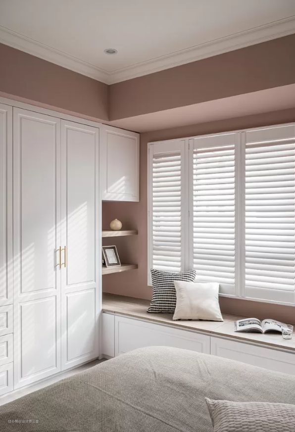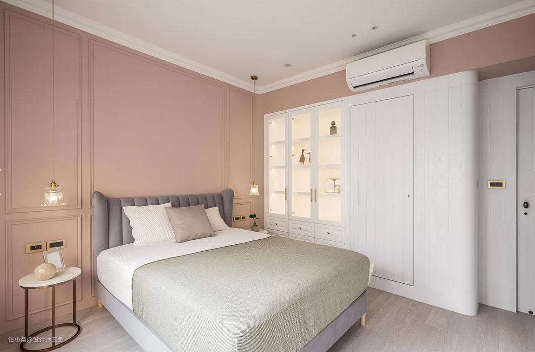 主卧的乳胶漆是珊瑚色,淡淡的粉色,不会太艳也不会太暗,粉嫩的刚刚好,搭配石膏线条,增加了整个空间的立体感。衣柜是定制的到顶衣柜,收纳十足也不易积灰。
