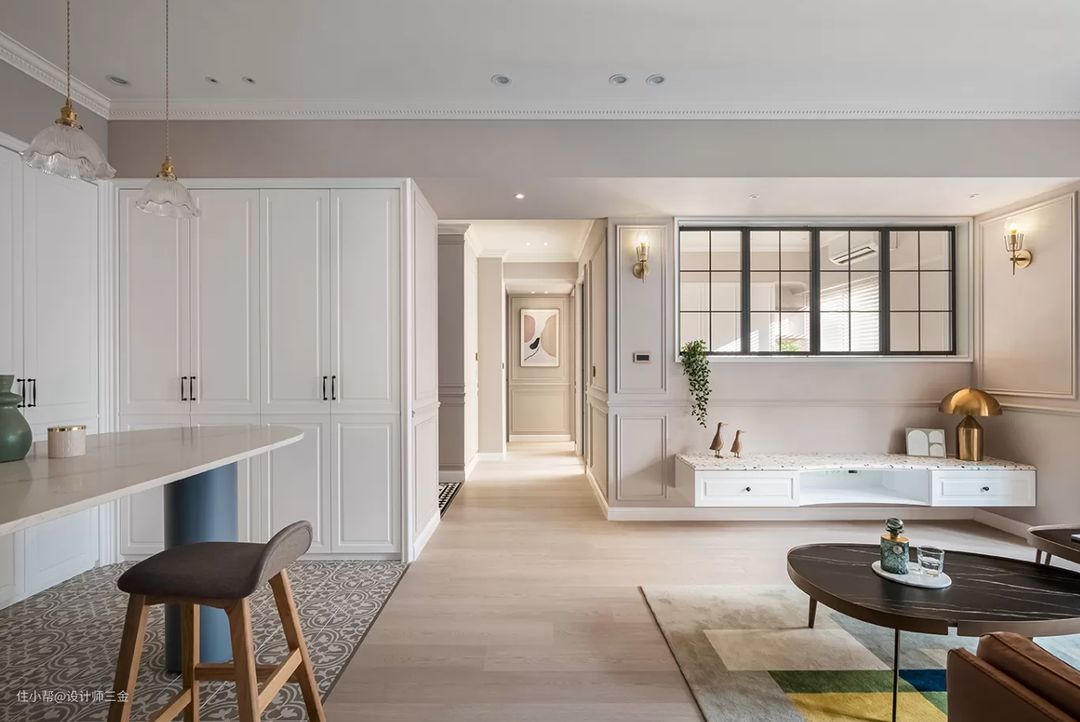 餐桌采用的是法式椭圆桌,餐边柜没有开放格,没有玻璃门,也没有很复杂的柜门,柜体柜门都用了象牙白搭配黑铜的把手,整体就是简约大气的设计,经典百搭不会出错。