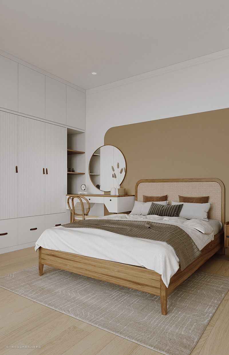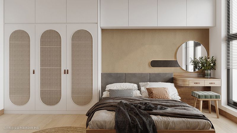 主卧最大的亮点就是组合柜的样式,这种圆弧形的平开门还是第一次见,外观个性时尚。而整面靠墙的组合柜杜绝了卫生死角,再配以明亮大气的米白色系,显得更加井然有序。