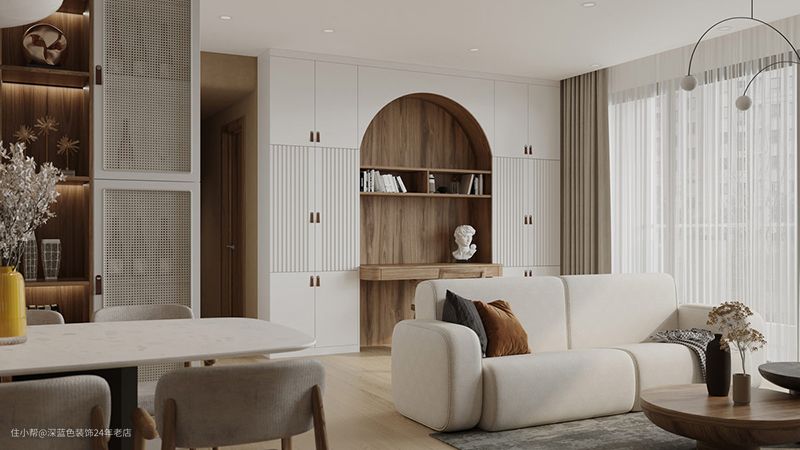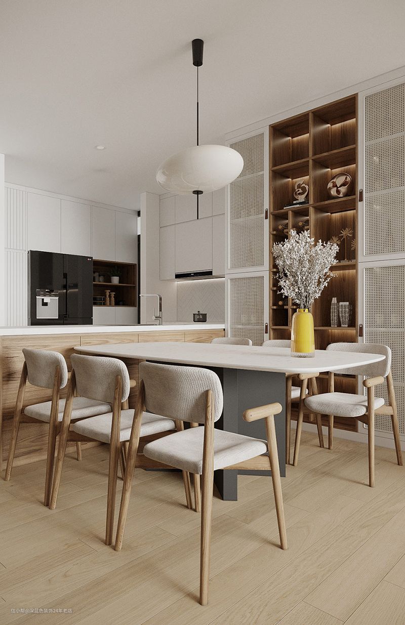餐厅做了半开放式做到顶的餐边柜,而从餐桌椅的外观和形状来看又比较偏向北欧风,简约耐用,温馨静谧的大地色系,给用餐得家庭成员带来了生活上的惬意与舒适。