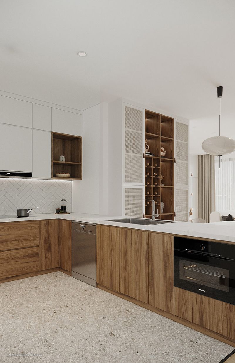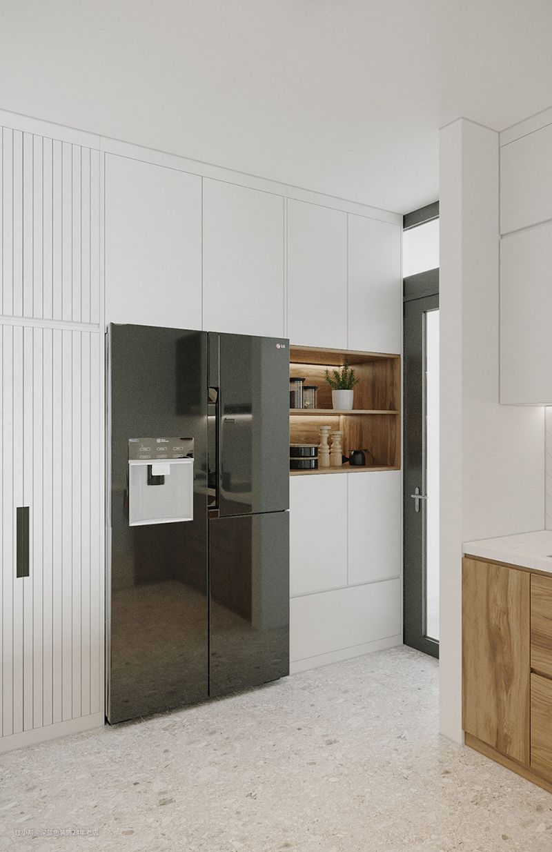 设计师做了开放式的厨房,这也是应业主的要求而设计的,在地柜中增加了内嵌式的烤箱和消毒柜,为生活带来了很大的便利,从柜体色调来说,纹路清晰自然能够增加整个空间的氛围。