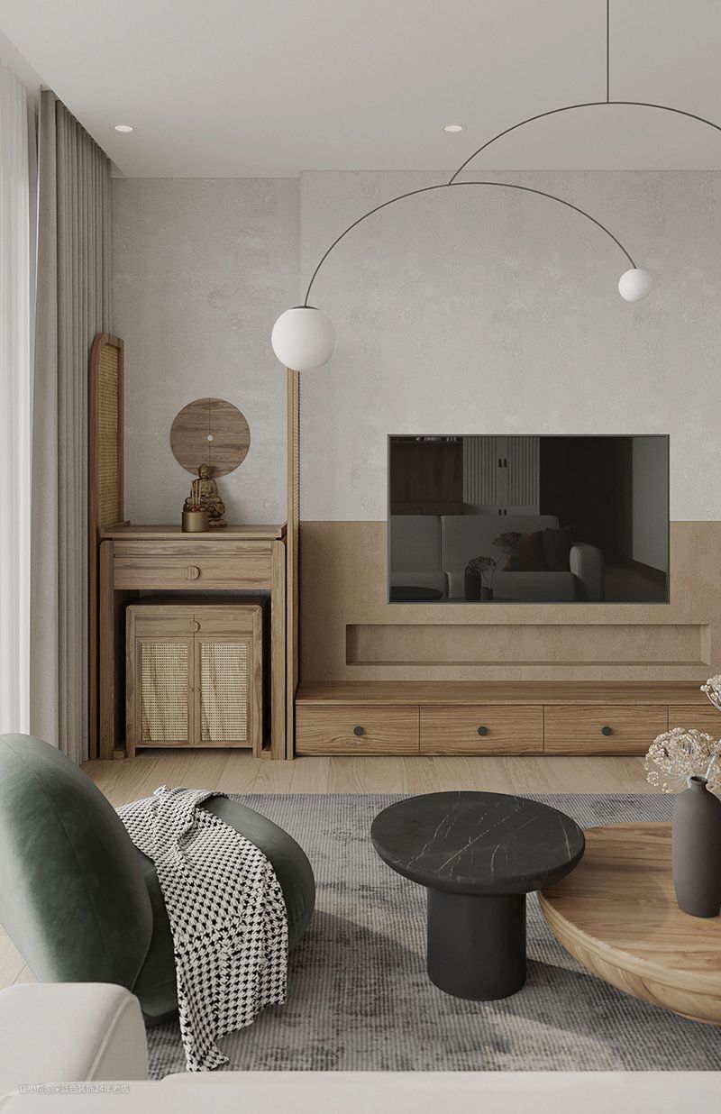 客厅主体空间呈现出典型的意式轻奢元素,高级灰色系的沙发座椅、胡桃木的茶几和电视柜,还有隐约点缀其中金属元素。
