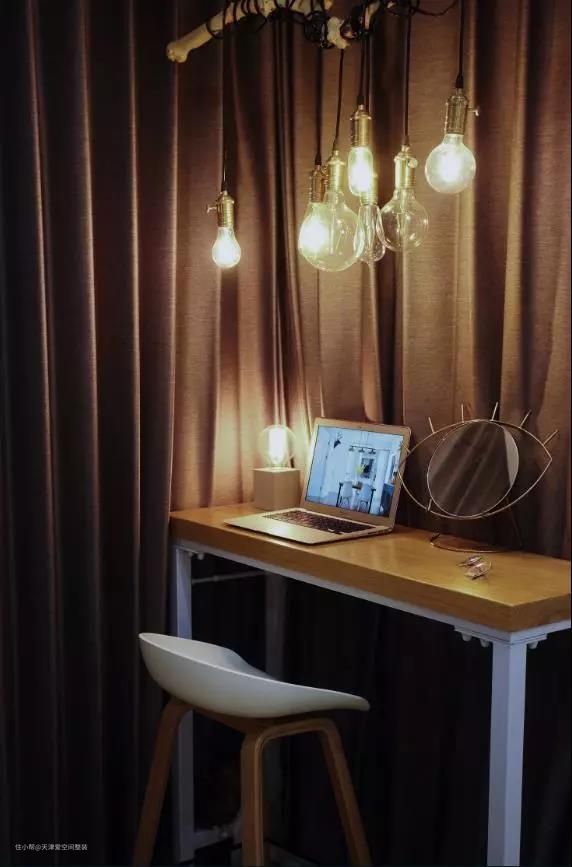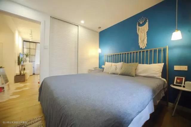 蓝色的墙面亮眼吸睛,细栏杆床头架简约轻盈。白色推拉门顶天立地柜简洁优雅。一个小桌上吊几顶复古简约灯泡温馨明亮。