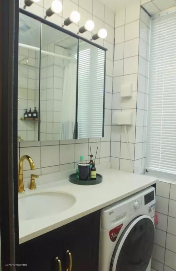磨砂玻璃推拉门保护隐私可透光线,淋浴区用防水帘隔离,洗浴不会外溅。洗衣机嵌入洗手池延长台面之下,洗澡换衣一步到位。