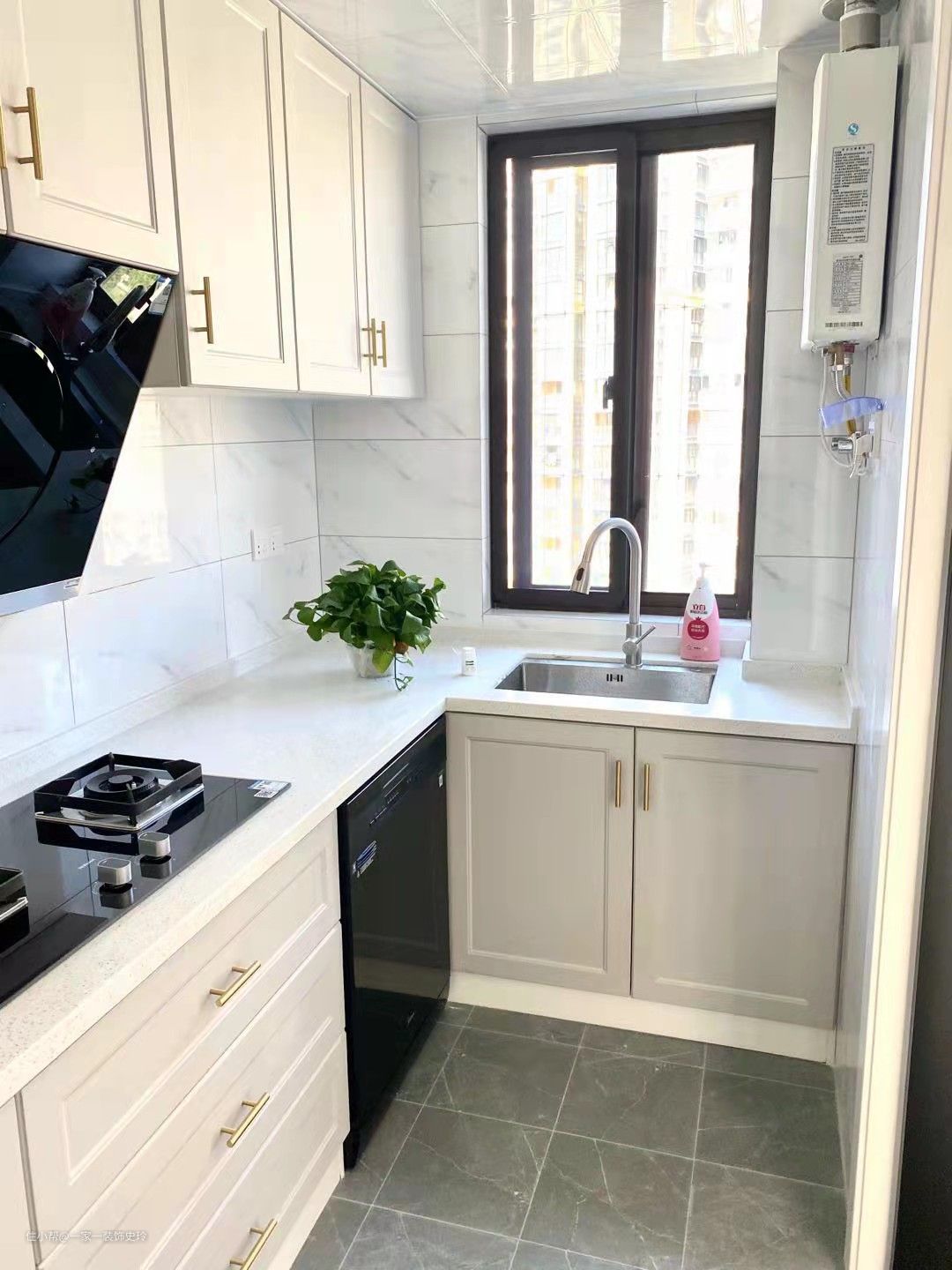 厨房整体面积不大,用了一个深色一点的地板,耐脏又好看,整体用的橱柜还是偏白色,干净明亮。厨房用了一个推拉门隔开,隔绝了油烟和水气。