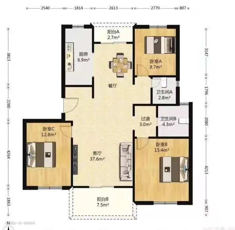这是一个120㎡的户型。业主是三代同堂,要求三个卧室,并且要求卧室与卫生间离得近一点,所以卧室A与卧室B都与卫生间紧挨,满足了客户的需求,最后就是业主要求现代轻奢风格,干净大方。