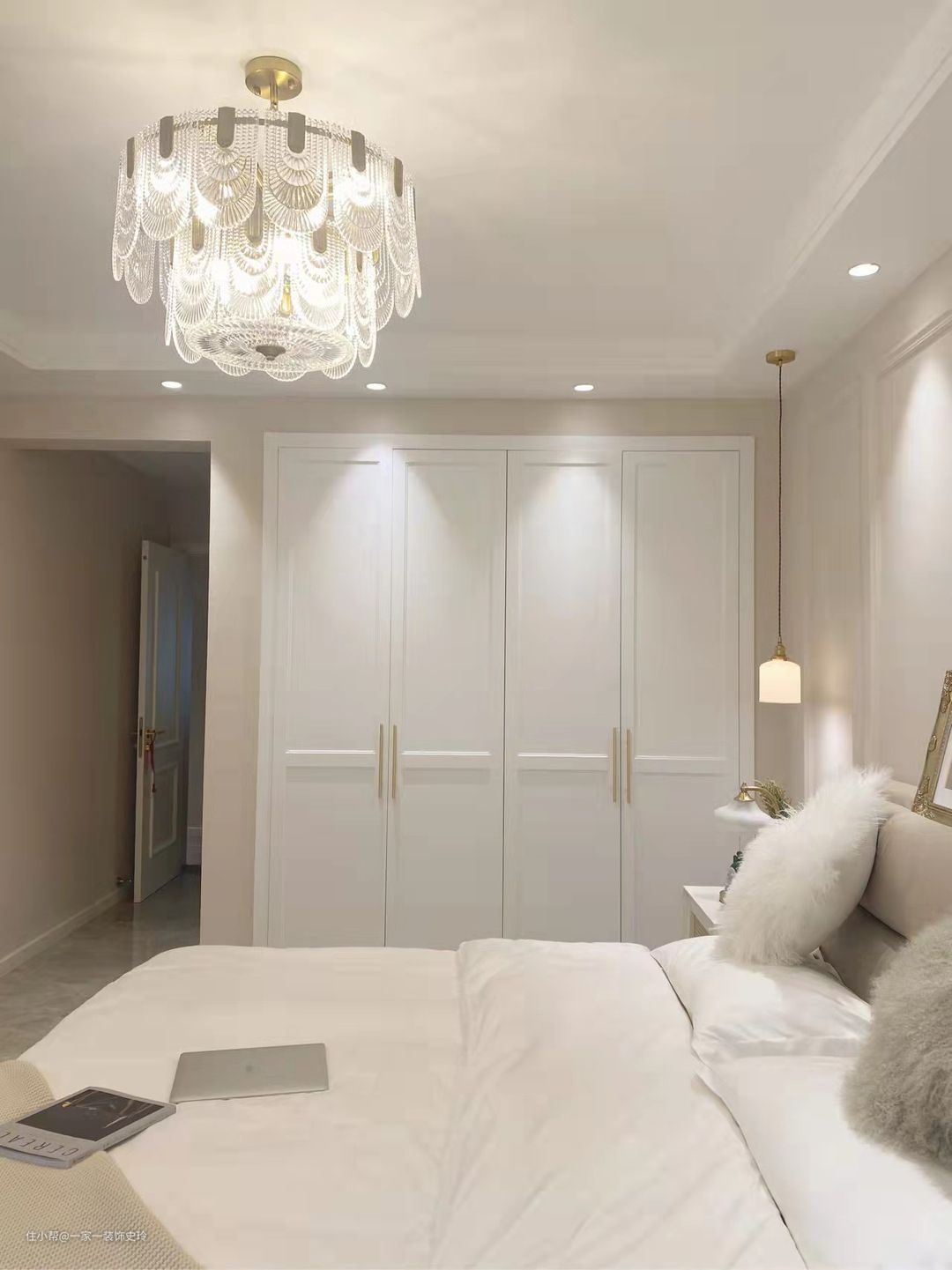 卧室整体的风格也比较简单,定制了一组白色的定制柜增加了卧室的收纳性。