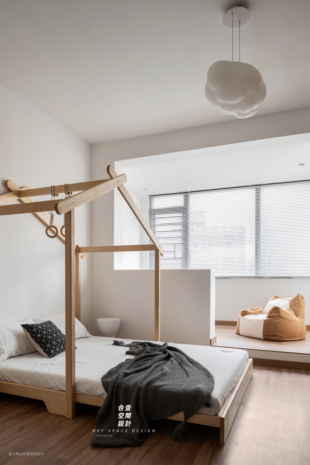 @合壹空间设计:原木带来的温柔细腻,融合淳朴的自然气息,不需要多余的修饰,加一盏可爱的蘑菇灯,一切都简单得刚好。