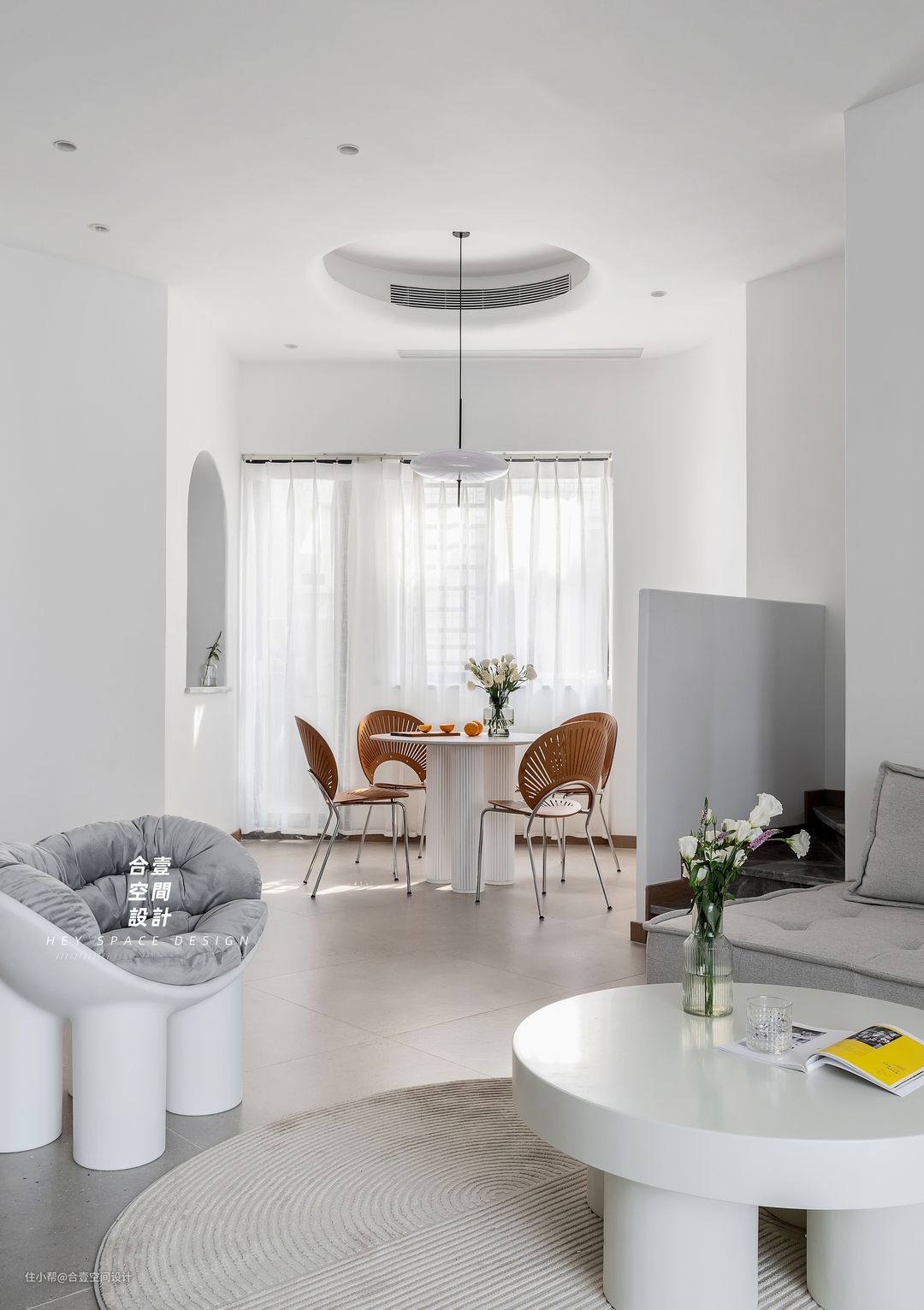 @合壹空间设计:没有棱角的弧形空间是柔软生动的,当纯白融入棕色的暖意,又平添一份和谐的交互感。
