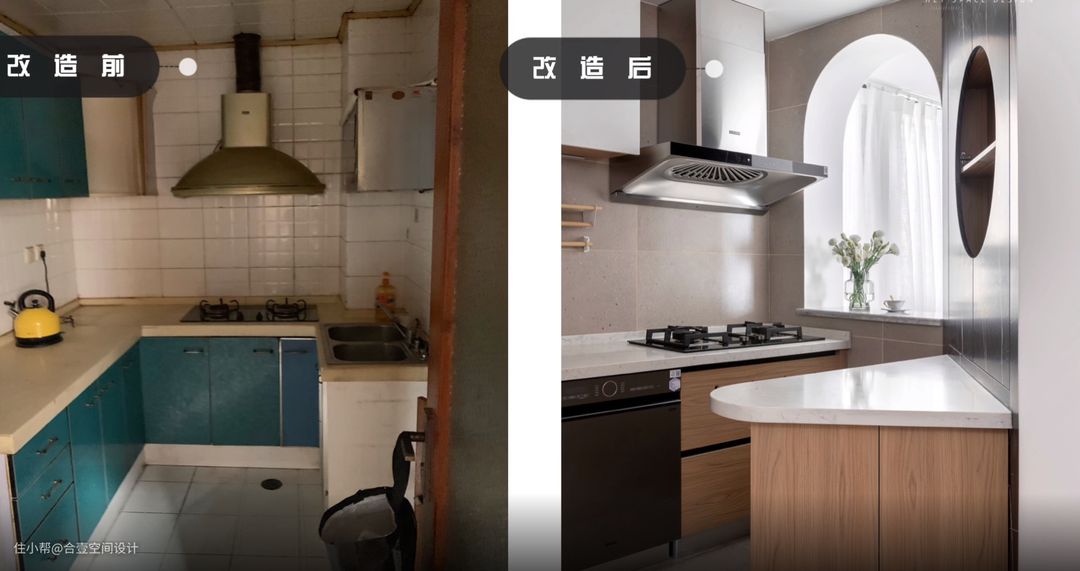 @合壹空间设计:窗外的自然光线穿过弧形窗口,照亮这方寸一隅,日光在窗内交汇,传递着窗内窗外这一饭一蔬带来的简单满足感。