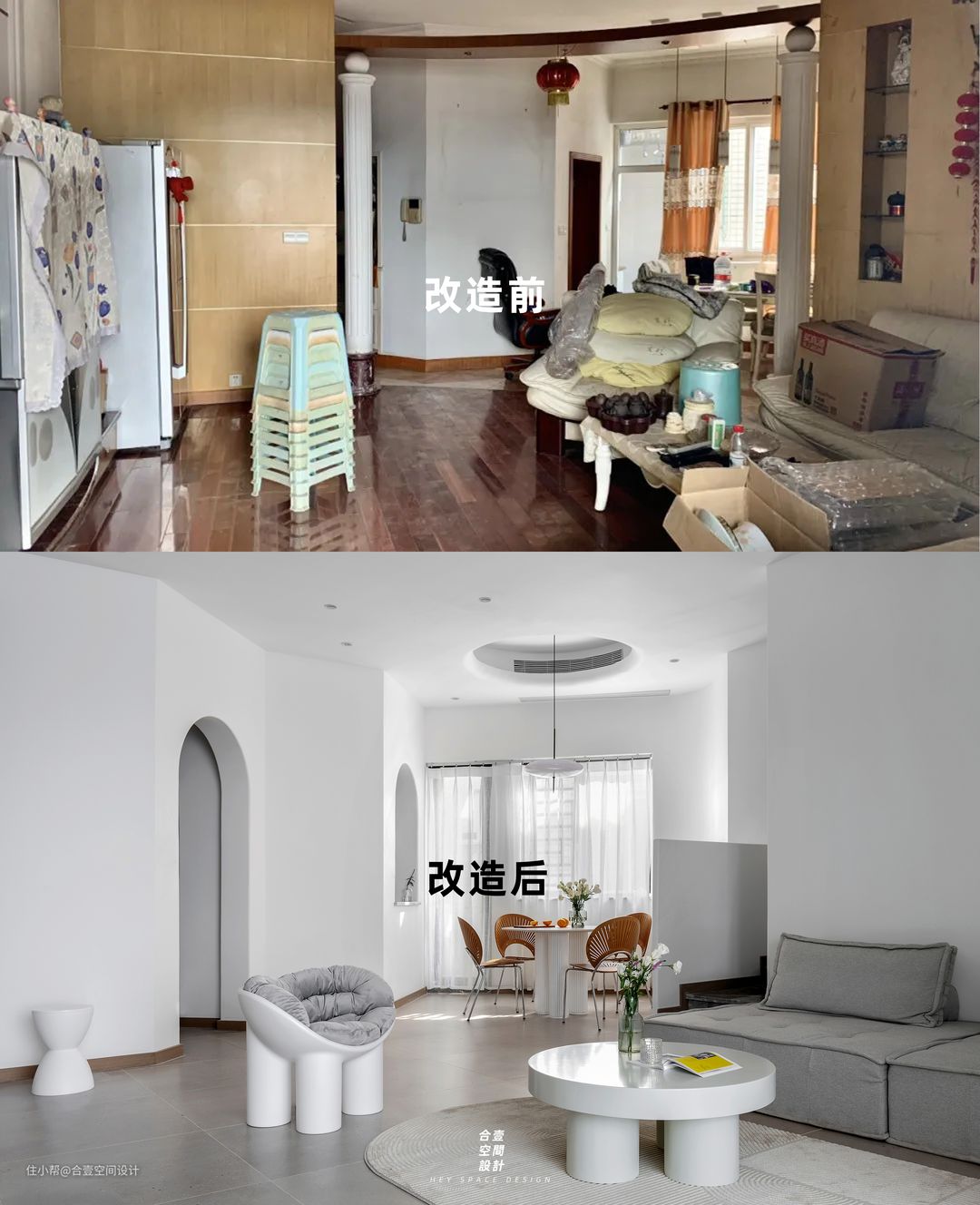 @合壹空间设计:原始结构分析: 1、此案例为旧房改造翻新,基本全承重结构,空间多为异性,布局限制大,有一定困难; 2、原始入户玄关较狭长,客厅屹立着两个粗大的罗马柱; 3、厨房门位于餐厅一侧,狭窄和操作十分不便; 4、错层楼梯入口位置在餐厅一角,相对会压缩餐厅空间; 5、客厅与休息区互通,影响整个休息区域的私密性; 6、主次两个卧室的阳台面积狭长,用柜子隔绝作睡眠与书房,但现业主无更多睡眠区需求。