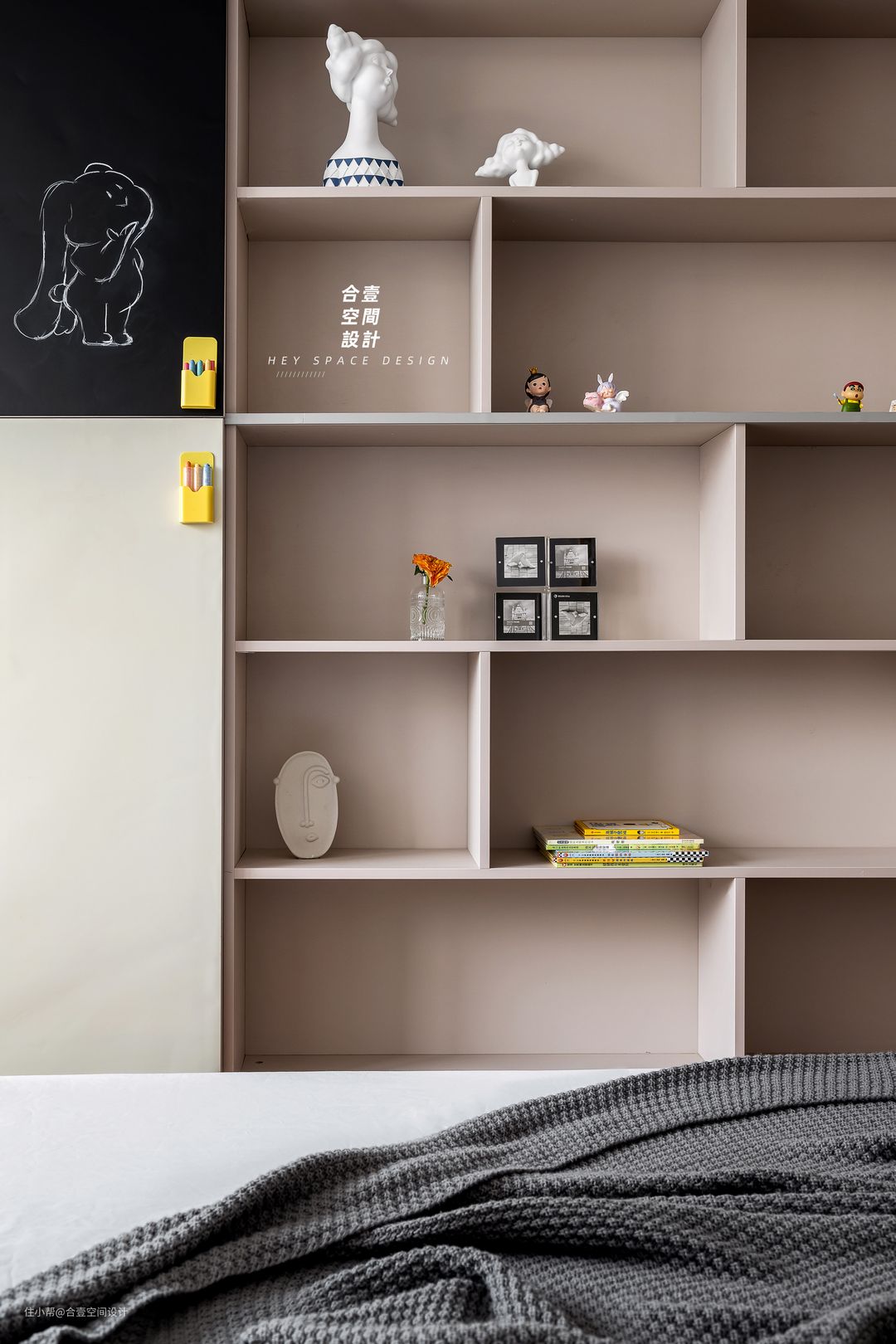 @合壹空间设计:黑板承载着孩子天马行空的想象,一面书柜,留下时光的印记,记录着童真岁月的点点滴滴。