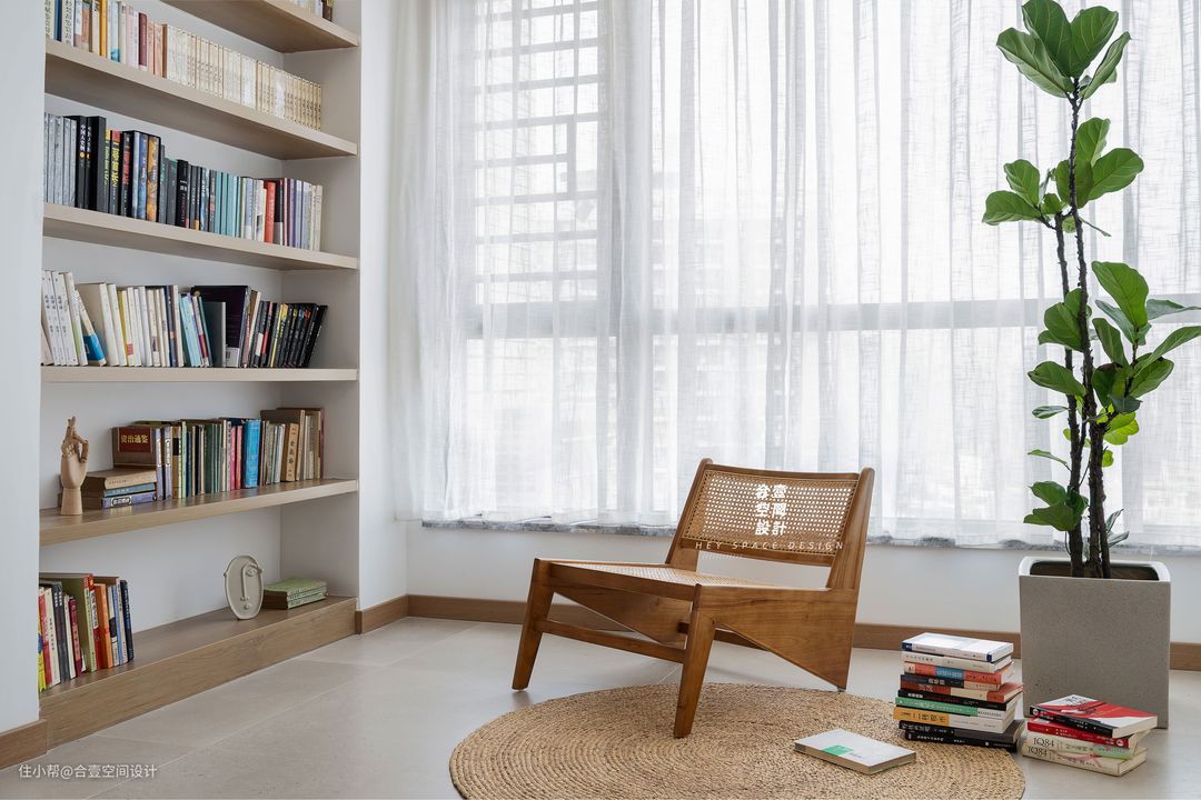 @合壹空间设计:休闲的阅读一角,轻纱也温柔了日光,午后伴着微风清茶,翻动晒暖的书页,沉浸于此的闲趣。