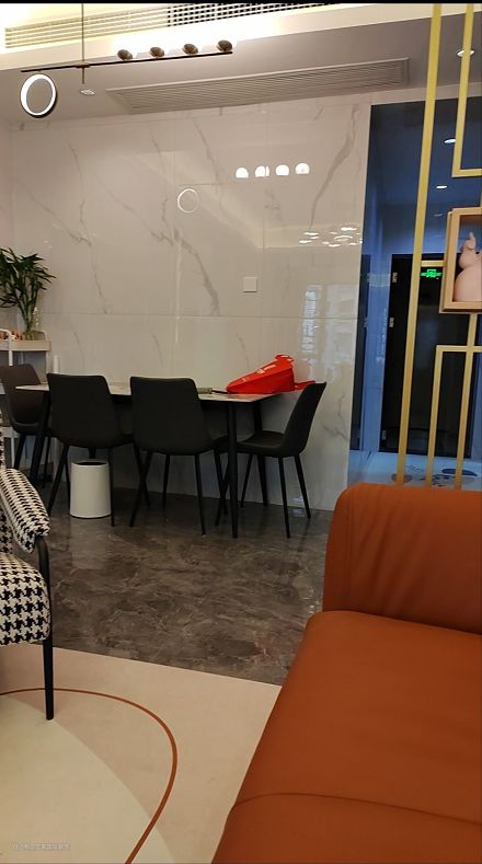 潘多拉灰的餐桌和潘多拉灰的背景墙相呼应,硬装整体灰色调,橙色的沙发活跃了整个空间,3000K色温的灯光使得整个空间温馨舒适!