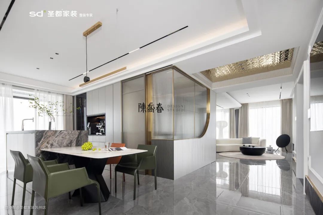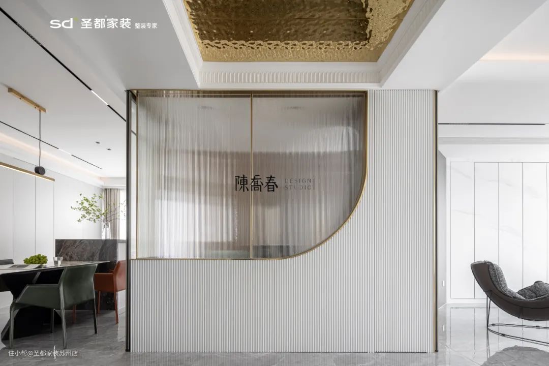 玄关的顶面采用定制石膏线与波纹不锈钢,背景金属走边勾勒包裹长虹玻璃,搭配干净而富有层次的格栅。入户衣柜用隐形柜门完美隐藏,琐碎的或厚重的皆收纳进诗意朦胧。
