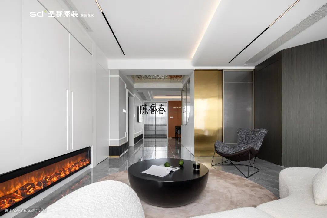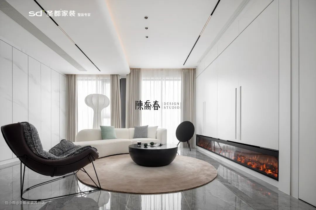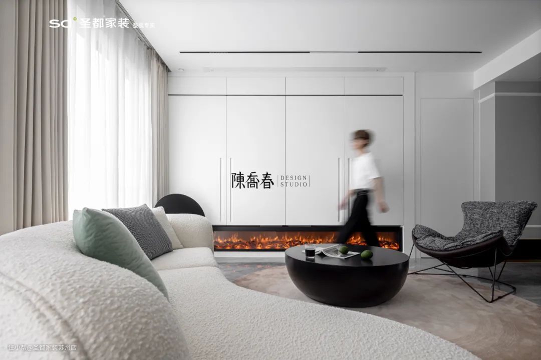 客厅采用无主灯设计,射灯与磁吸式轨道灯结合,弧形吊顶的设计弱化了梁体结构,沉稳低调的意式家具呈环抱型,优化了空间形体。