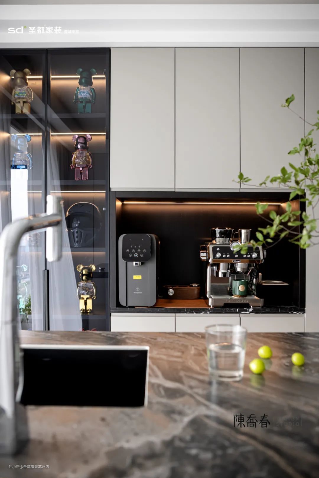 西厨区整墙柜,除了用来收藏暴力熊,还给咖啡机和直饮水机留出了足够的空间,减轻了厨房的储物压力。