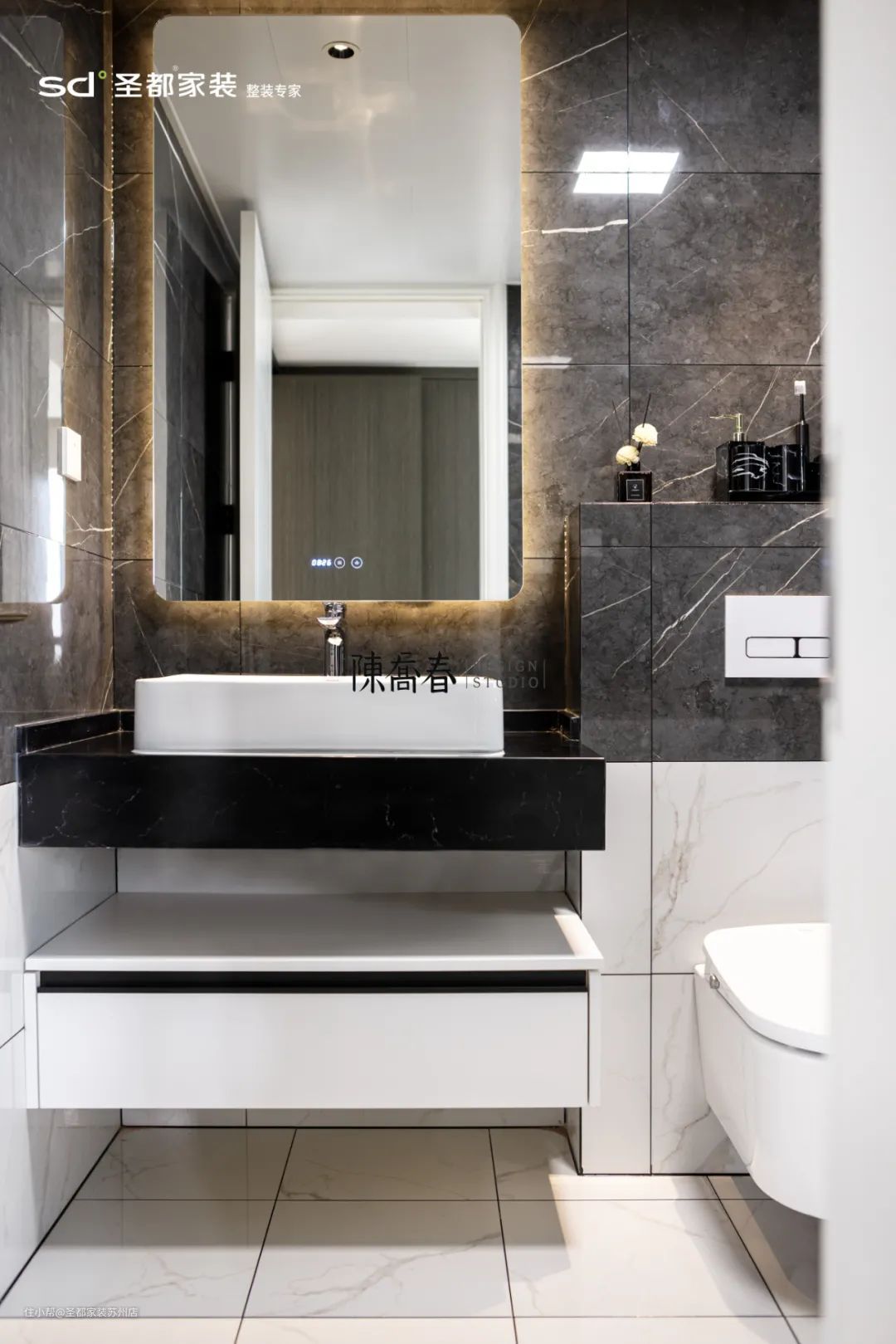 次卫洗漱台造型简约,方便打理,下方悬空柜可以放常用物品。壁挂式坐便器方便地面清理,保持洗浴区卫生。