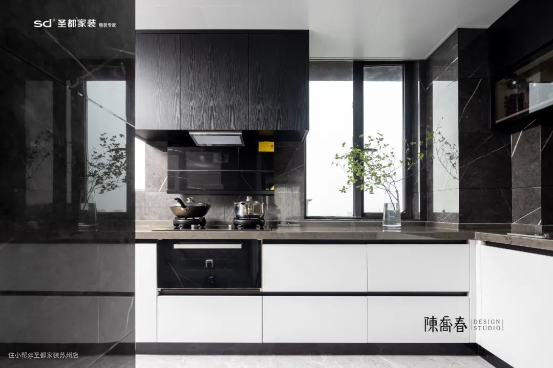 北边小阳台扩入厨房,厨房操作台呈“L”型布局,部分电器移到西厨区域,整个操作动线一气呵成。
